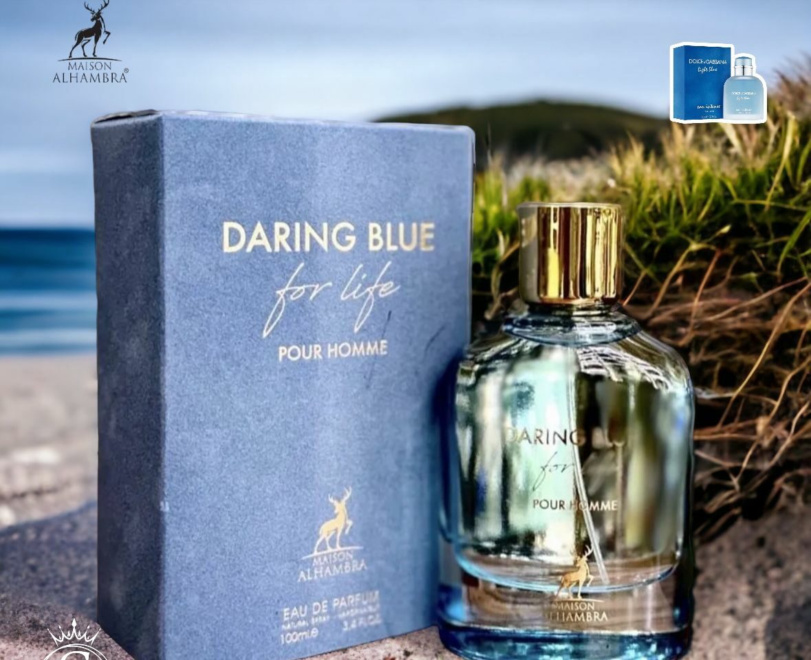 Maison Alhambra Daring Blue For Life es una fragancia masculina aromática cítrica ozónica. Se abre con pomelo y bergamota, tiene un corazón fresco de notas ozónicas y hoja de violeta, y culmina en una base cálida de vetiver de Java, pachulí y almizcle blanco.